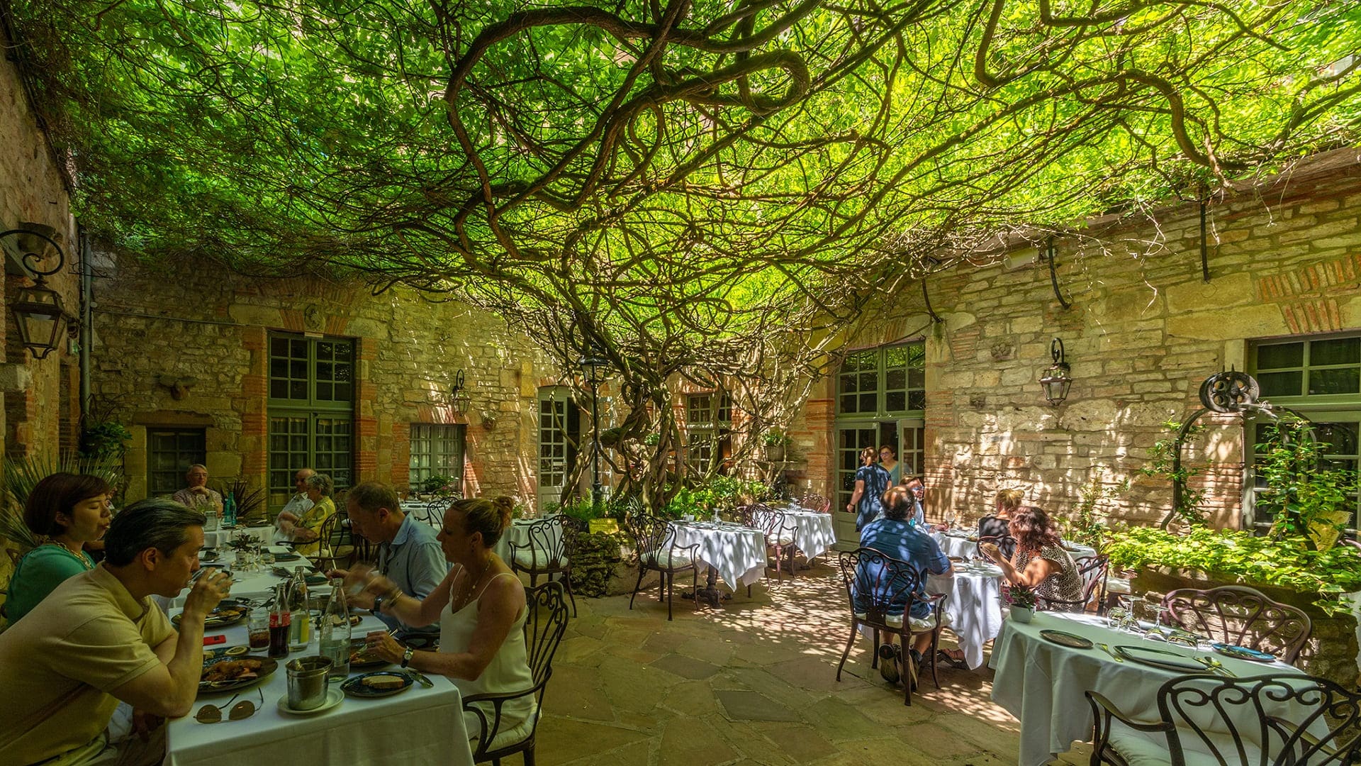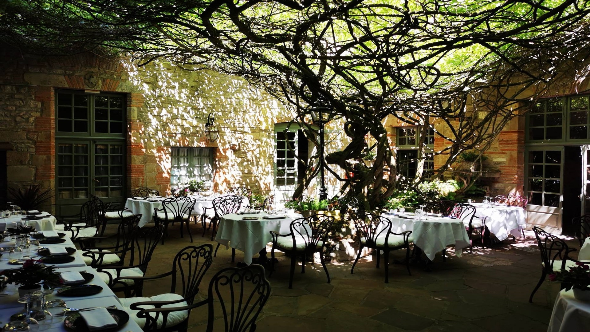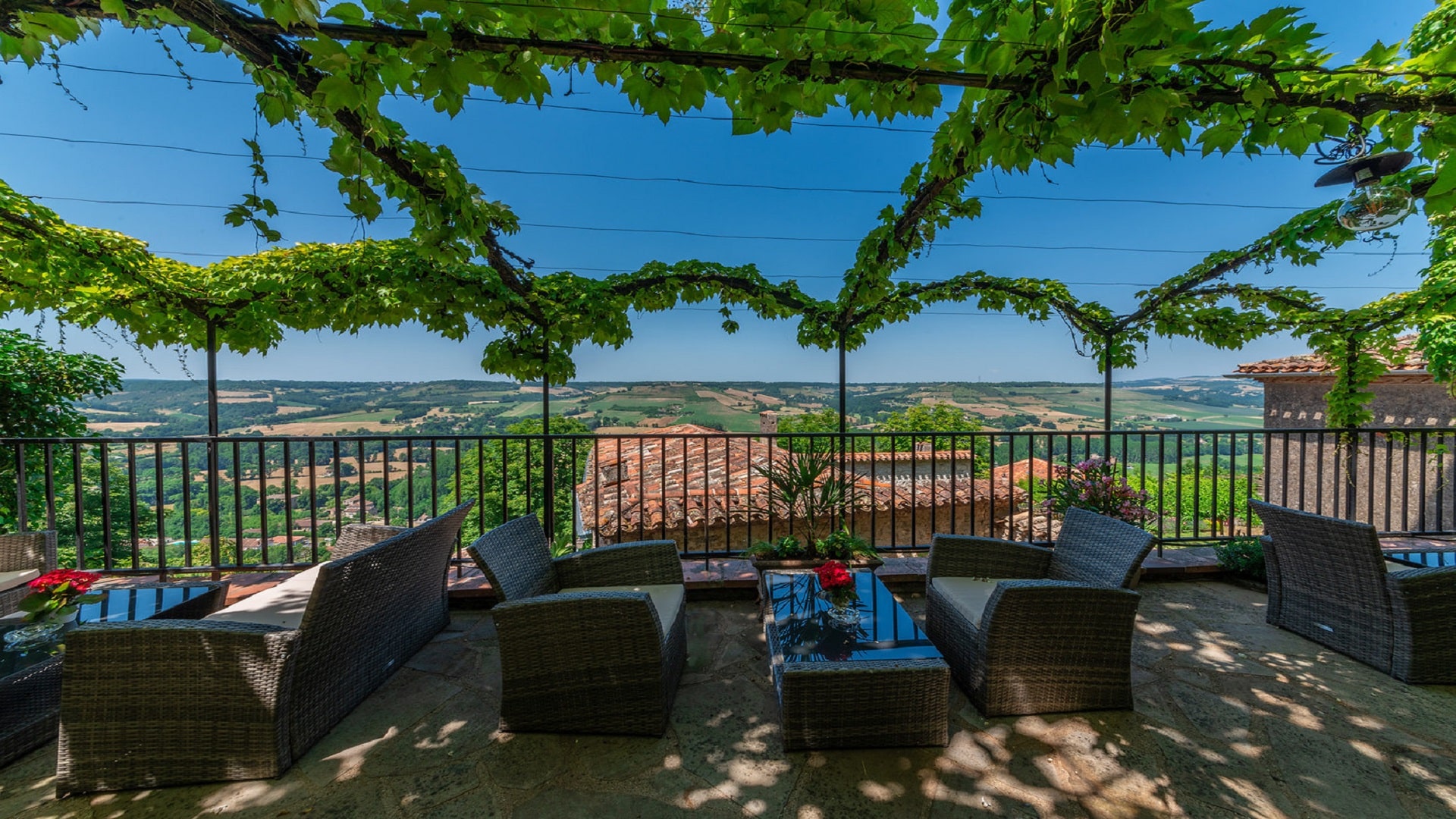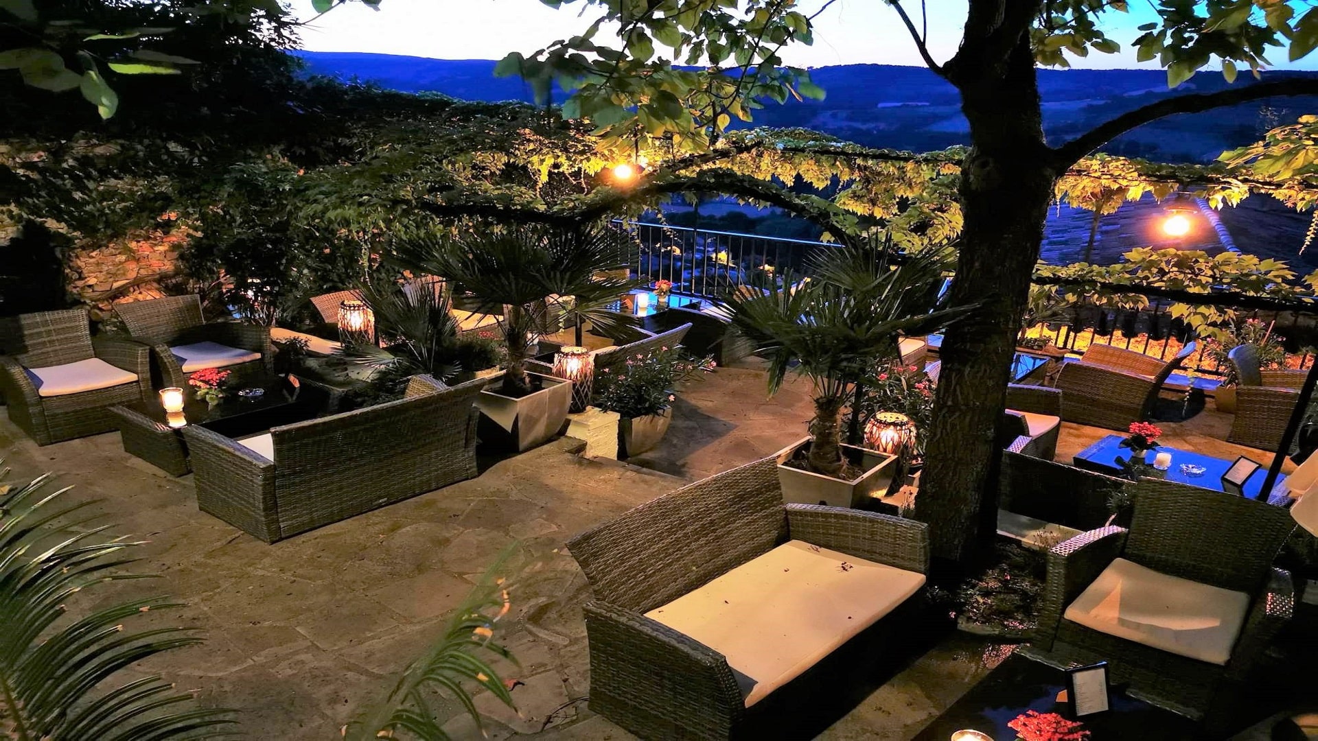 L’hôtel dispose d’un patio ombragé et d’une glycine tricentenaire. La terrasse offre une vue exceptionnelle sur la vallée du Cérou.