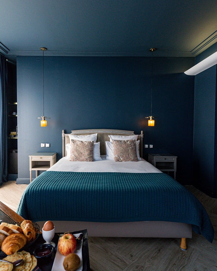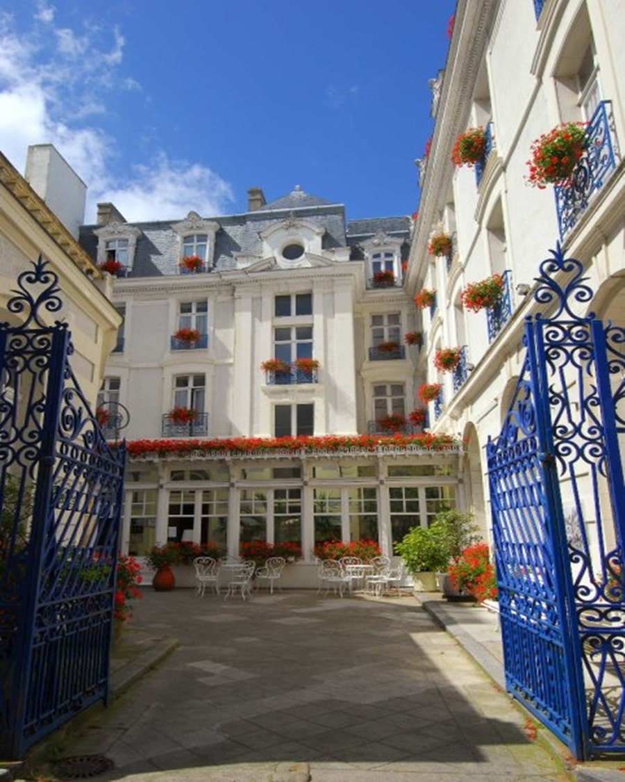 La somptueuse grille bleue de l’hôtel France et Chateaubriand ouvre sur une cour intérieure. Découvrez au-dessus du perron menant à la maison natale de l’écrivain, les armoiries et la devise de sa famille : « Mon sang a teint les bannières de France »