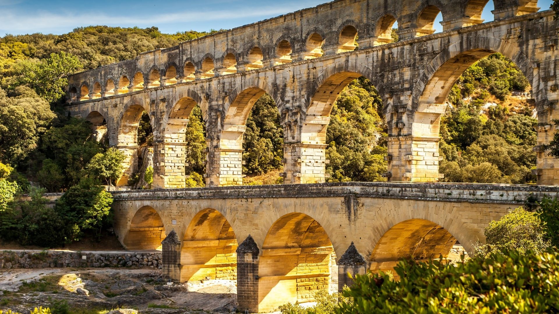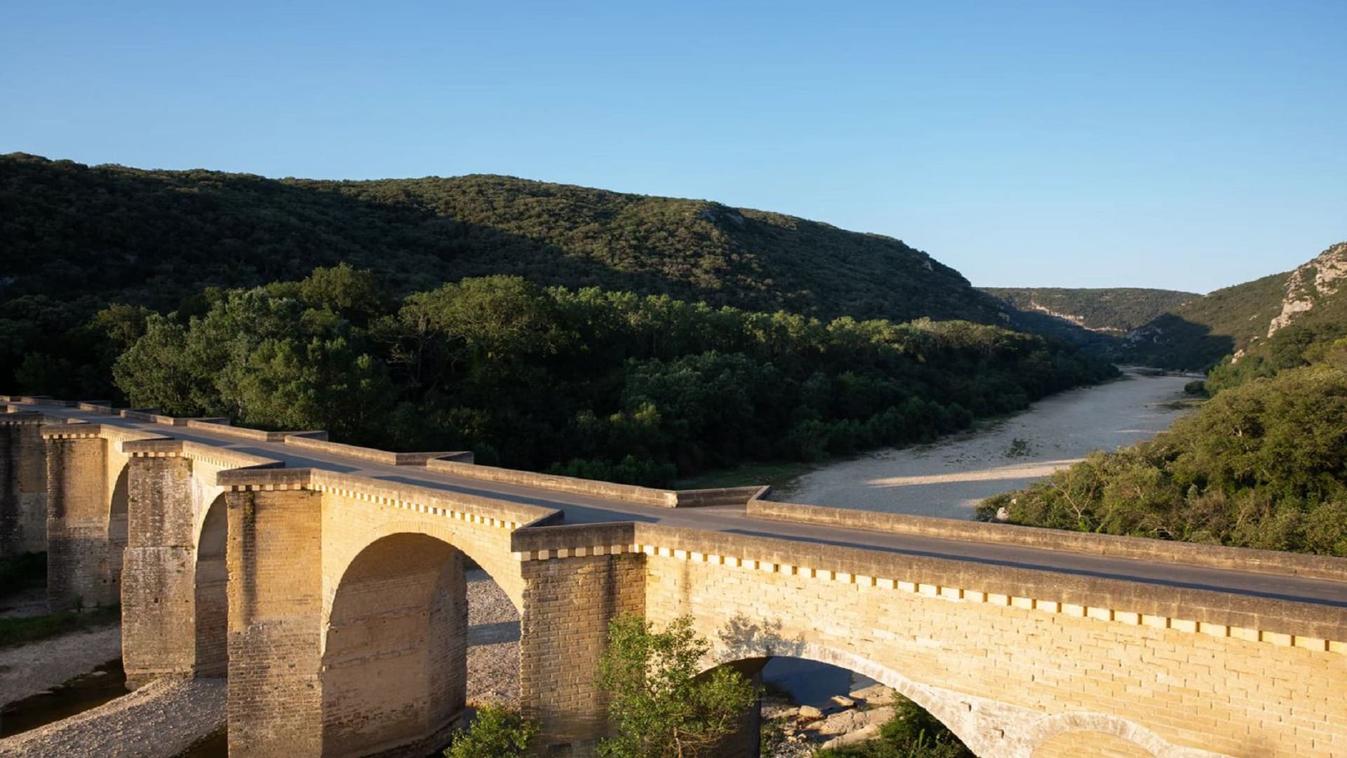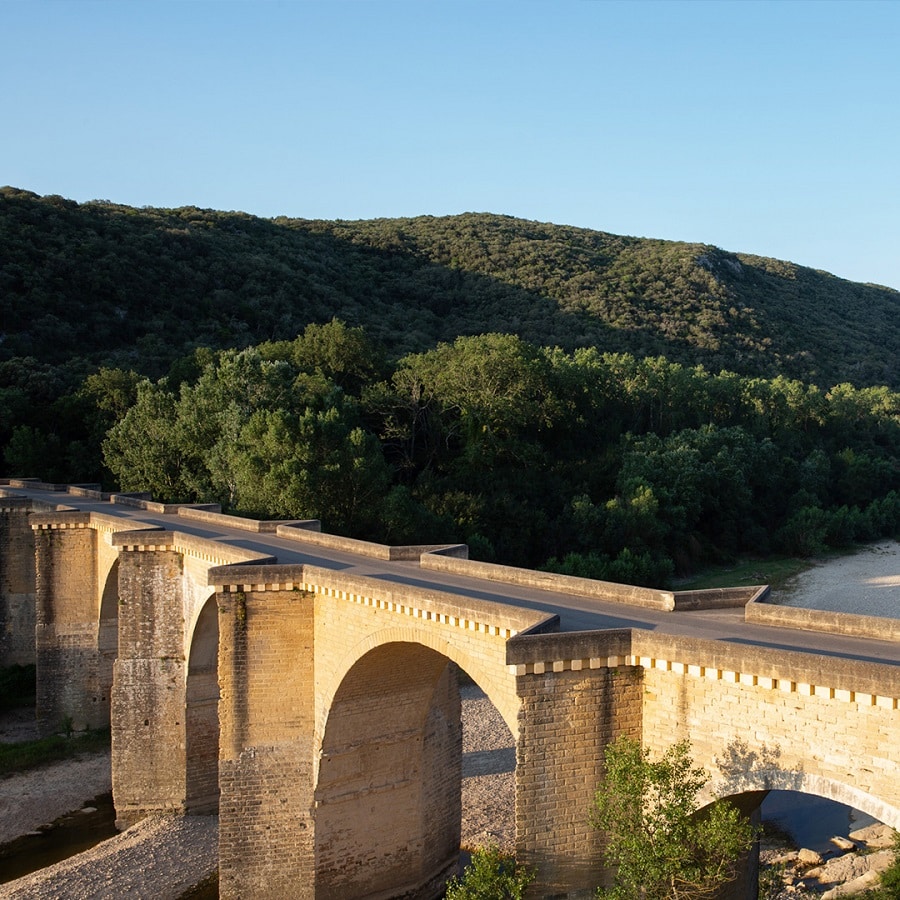 Puis après avoir longé la vallée du Gardon s’écoulant vers le Pont du Gard, la départementale en pente débouche soudainement sur un pont aux sept arches de pierre en ogives, (dotées d’avant-bec pour détourner les eaux) furent érigées en 1260.